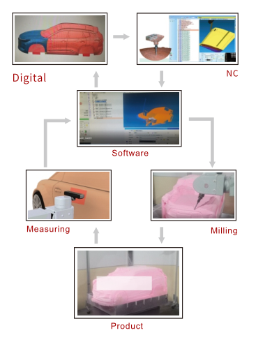 造型模型不用移动,所有的造型过程可以从毛坯开始直至完成都可以在一台设备上完成。新的理念所带了得好处是,免除了模型在多个设备之间搬运和安装对准工序,在经济上节约了用于搬运的场地,时间、人工和设备等。在效率上,可以多个车模或模型件,多项任务可以同时并行,高效的发挥了设备的利用率。据客户的使用效果分析,比传统方法节省成本和提高效率约为40-60%。
